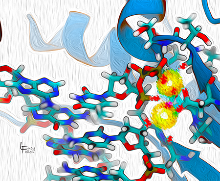 DNA polymerase is responsible for faithfully replicating DNA chains in most organisms and some viruses. Using one DNA strand as a template, it links DNA bases to form a matching DNA chain. The active site is where the chemistry for lengthening the chain takes place. It uses two magnesium ions (yellow) to catalyze the reaction.