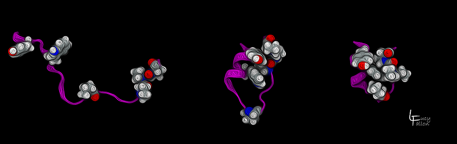 Here is one of the Simmerling Lab’s favorite model proteins: TrpCage (pronounced “trip cage”), a small protein that folds into a distinct, well-defined shape. It begins in its extended, unfolded form (left), then collapses its core residues (shown as red and white atoms) on top of each other (middle). Finally, it folds into its native functional state (right), where the core residues stack on top of each other to form a ‘cage’.